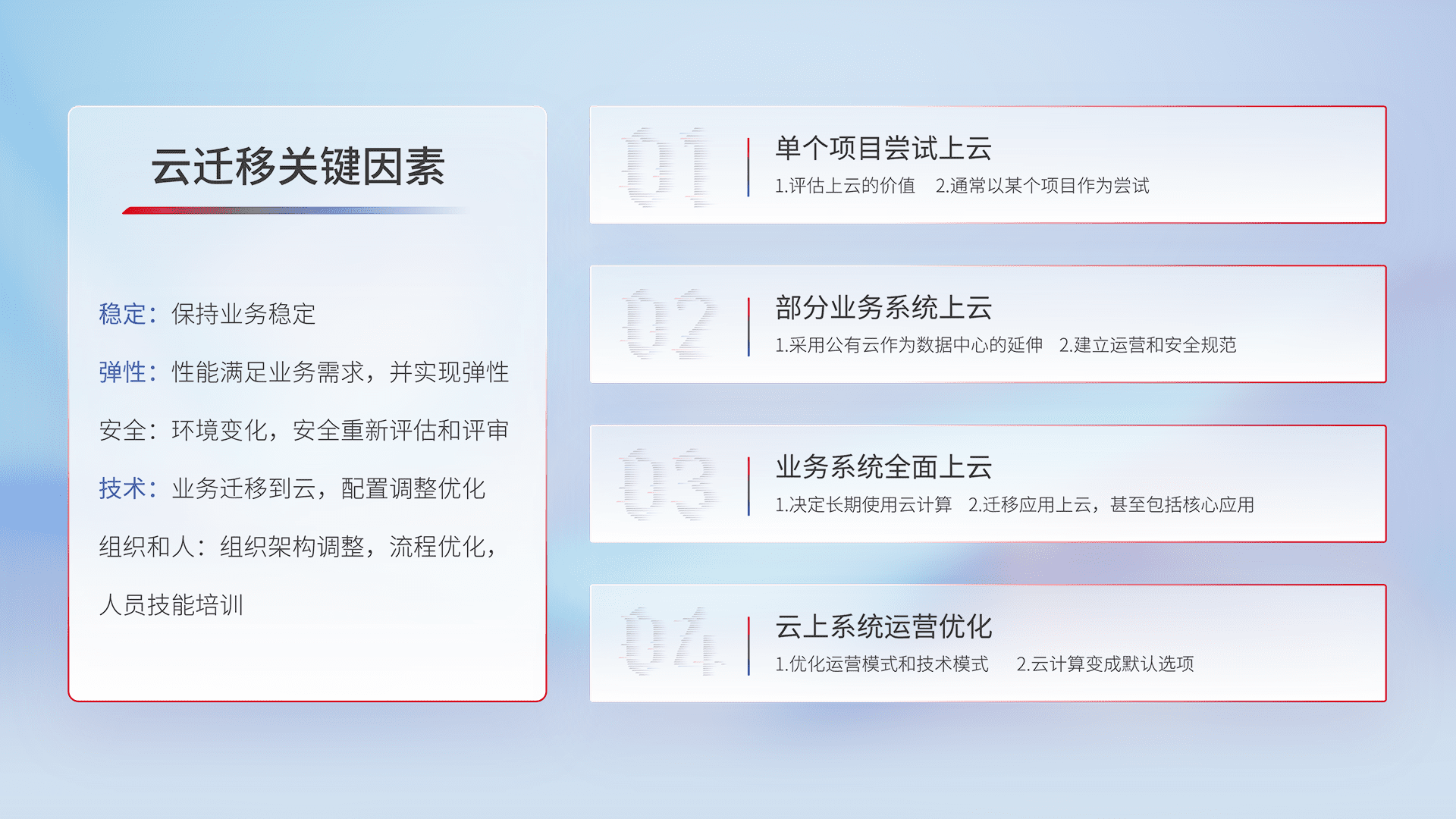 结合实际业务,,,,从规划设计、、云平台选型、、、、云原生改造、、、数据迁移、、集成交付,,,,迁移全过程为客户识别最佳上云路径,,,,做好风险识别管理,,设计网络架构、、、身份权限、、、安全审计合规、、、操作审计、、、日志审计、、、、监控告警策略、、、、多站点容灾设计等,,对云上基础设施进行整体规划,,,提升IT治理水平,,以满足弹性、、、高可用、、、高性能的需求。。
