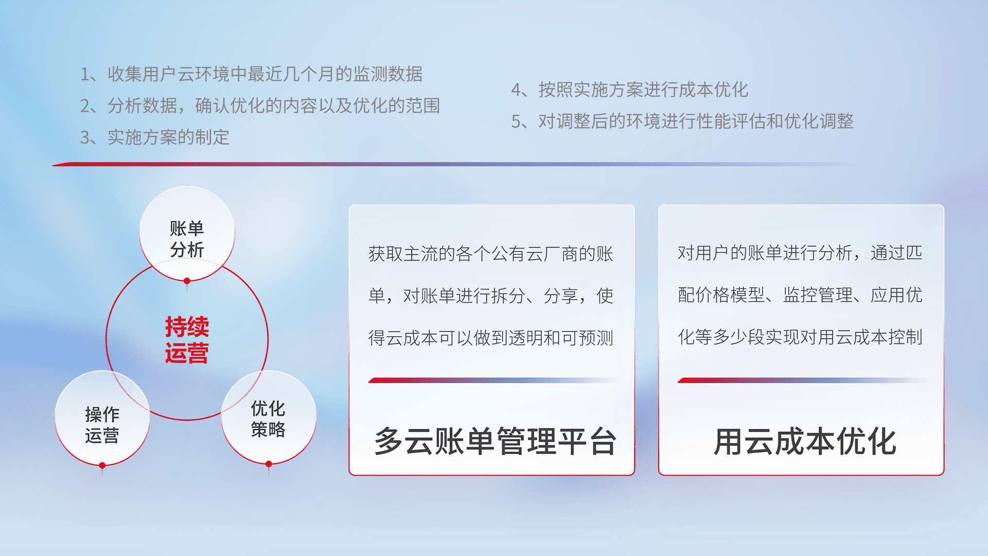 通过多云纳管,,,以统一的资源数据模型把客户的云资源进行抽象和封装,,,进而实现对多云资源的统一操作,,保障云资源管理的可靠性、、、稳定性与可用性。。量身定制化运维内容,,配置、、、、开发运维、、、、补丁管理、、备份、、、、监控、、认证和访问管理、、、审计和日常巡检等,,,,保障在用云过程中的可靠度,,,,稳定度以及高可用率。。
